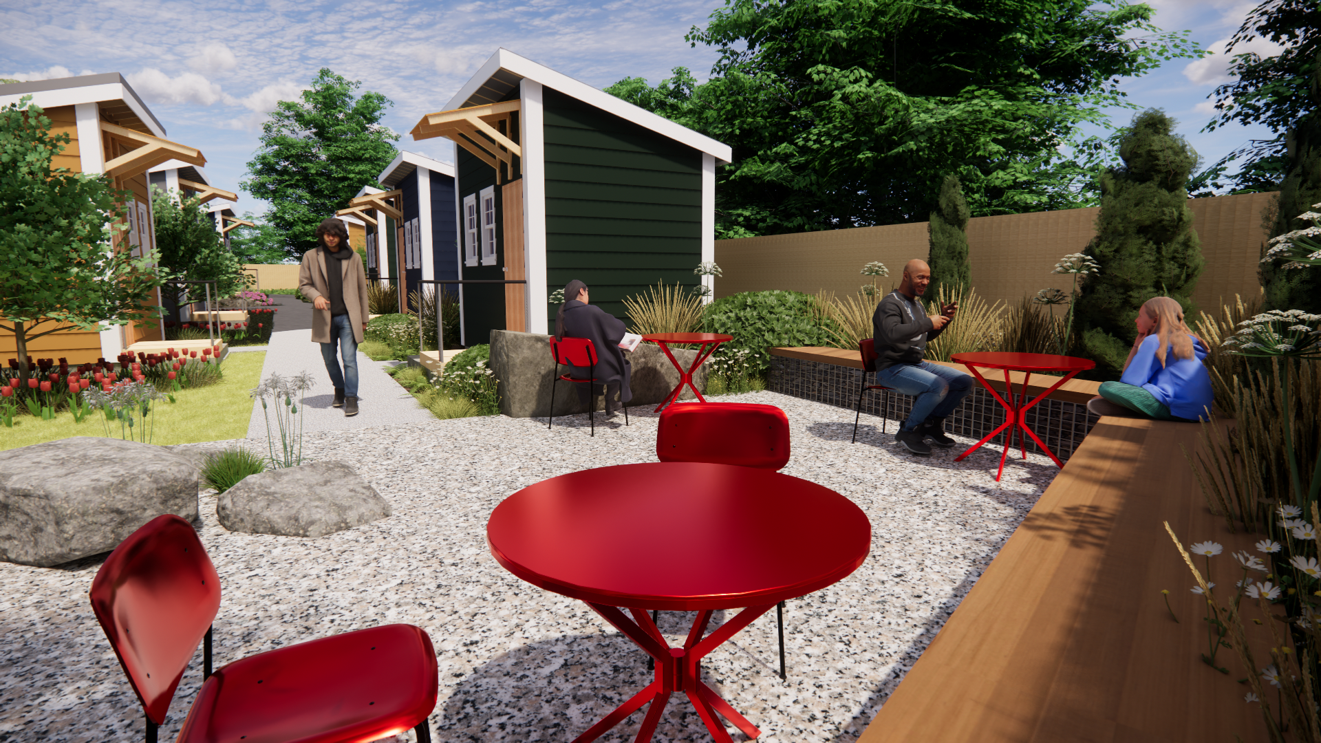 This masterplan is thoughtfully crafted to promote healing and strengthen community bonds. The landscape design features native plant species blended with soft-textured ornamental grasses and perennials, creating a calming and restorative environment around the residents’ homes. While lush with foliage, the planting design provides a low maintenance landscape reducing needs for continuous watering, mowing, and weeding. Pathways connect essential communal zones where people can gather, as well as quieter, more secluded areas for contemplation and relaxation. A secure fence encloses the rear of the housing area, offering safety and privacy, while a gabion fence at the front maintains an open visual connection to the broader Touchstone campus facilities.