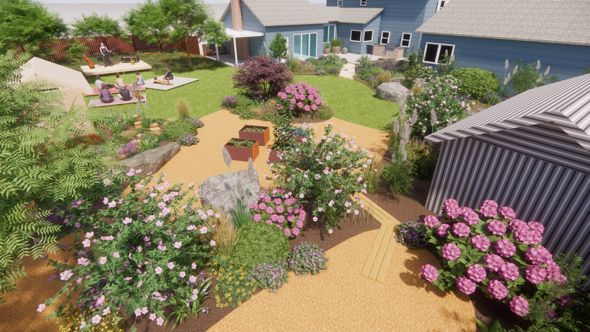This masterplan is thoughtfully designed to foster a strong sense of community, both for the neighborhood’s residents and for the surrounding natural ecosystem. It emphasizes inclusive spaces that encourage connection, interaction, and shared experiences among people of all ages. Features such as gathering areas, multi-generational play zones, community notice boards, and interactive green spaces invite meaningful engagement. Lush plantings, including a wide variety of cut flowers and native plant species, add color, texture and fragrance to the landscape while encouraging moments of pause and appreciation. The result is a lively, welcoming environment that supports everyday encounters, celebrates seasonal beauty, and strengthens the bond between people and landscapes.