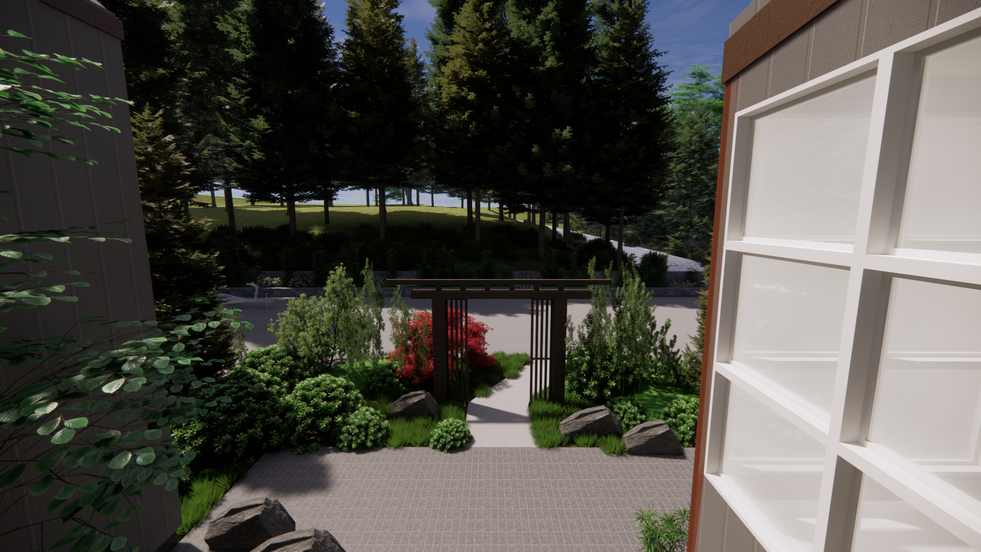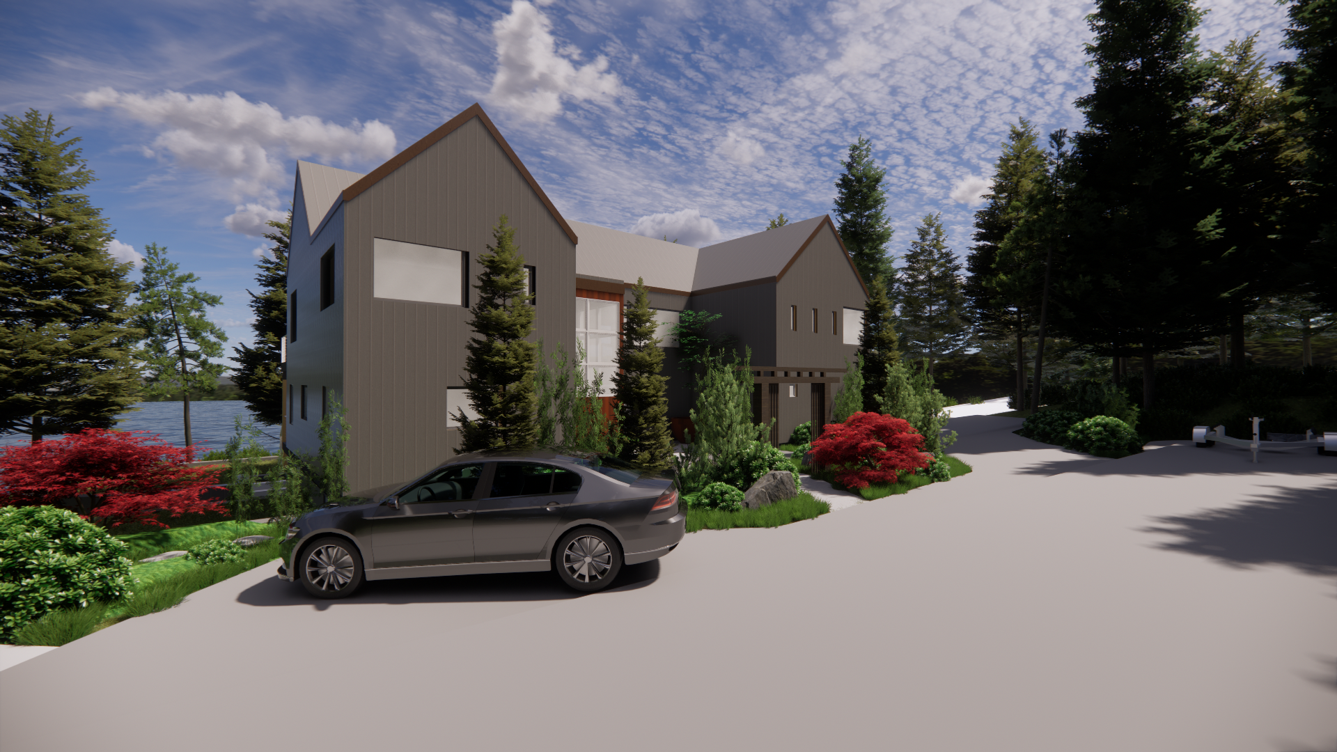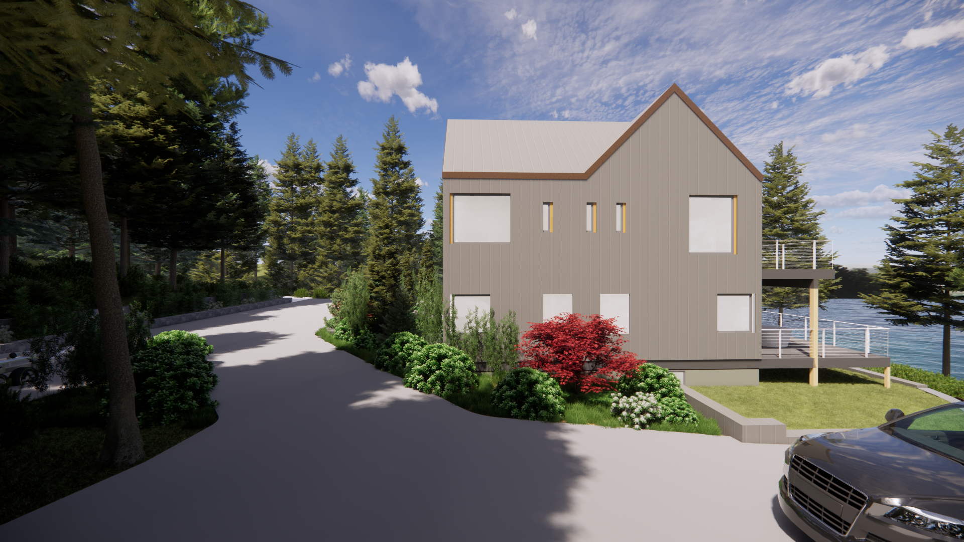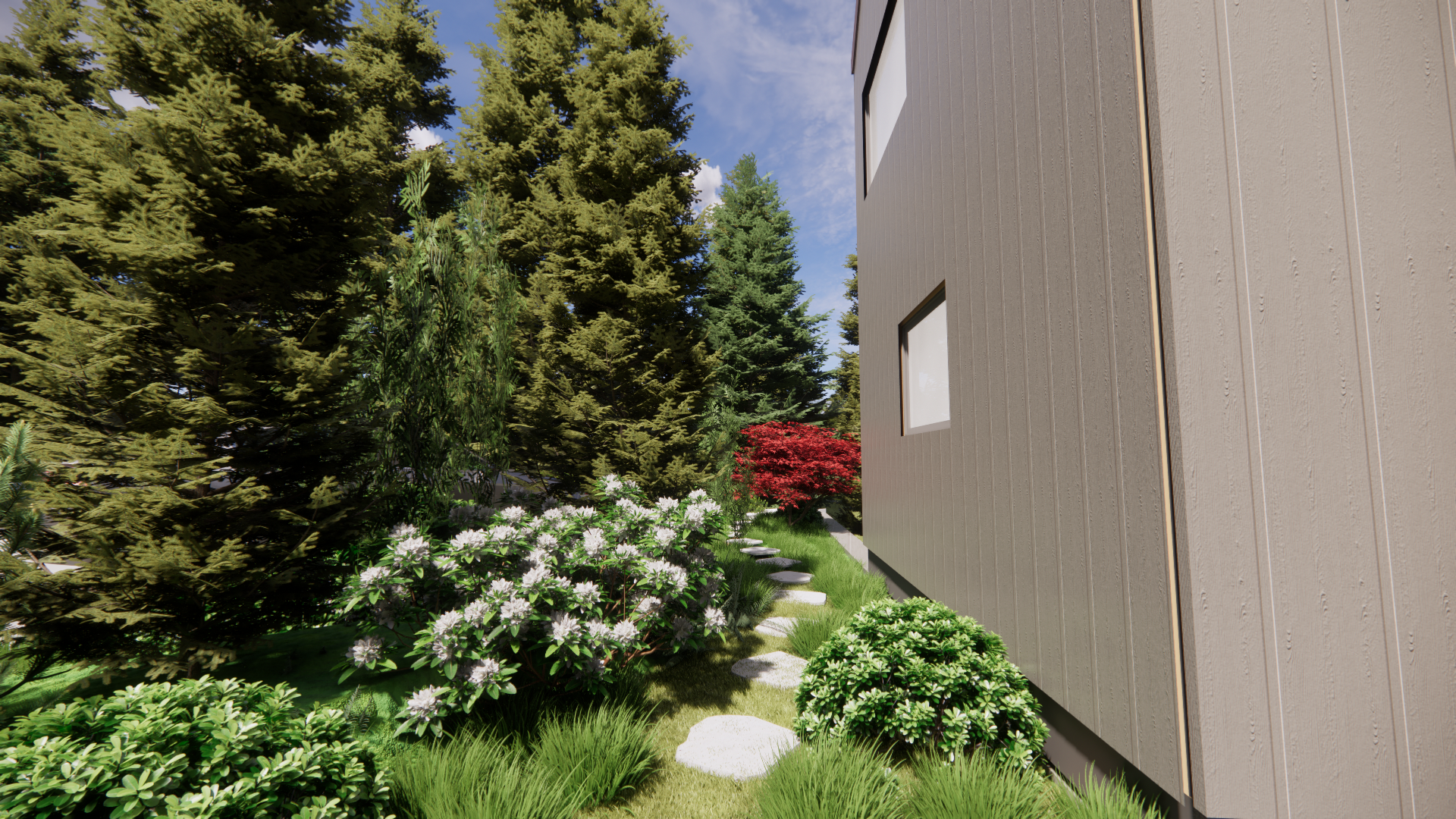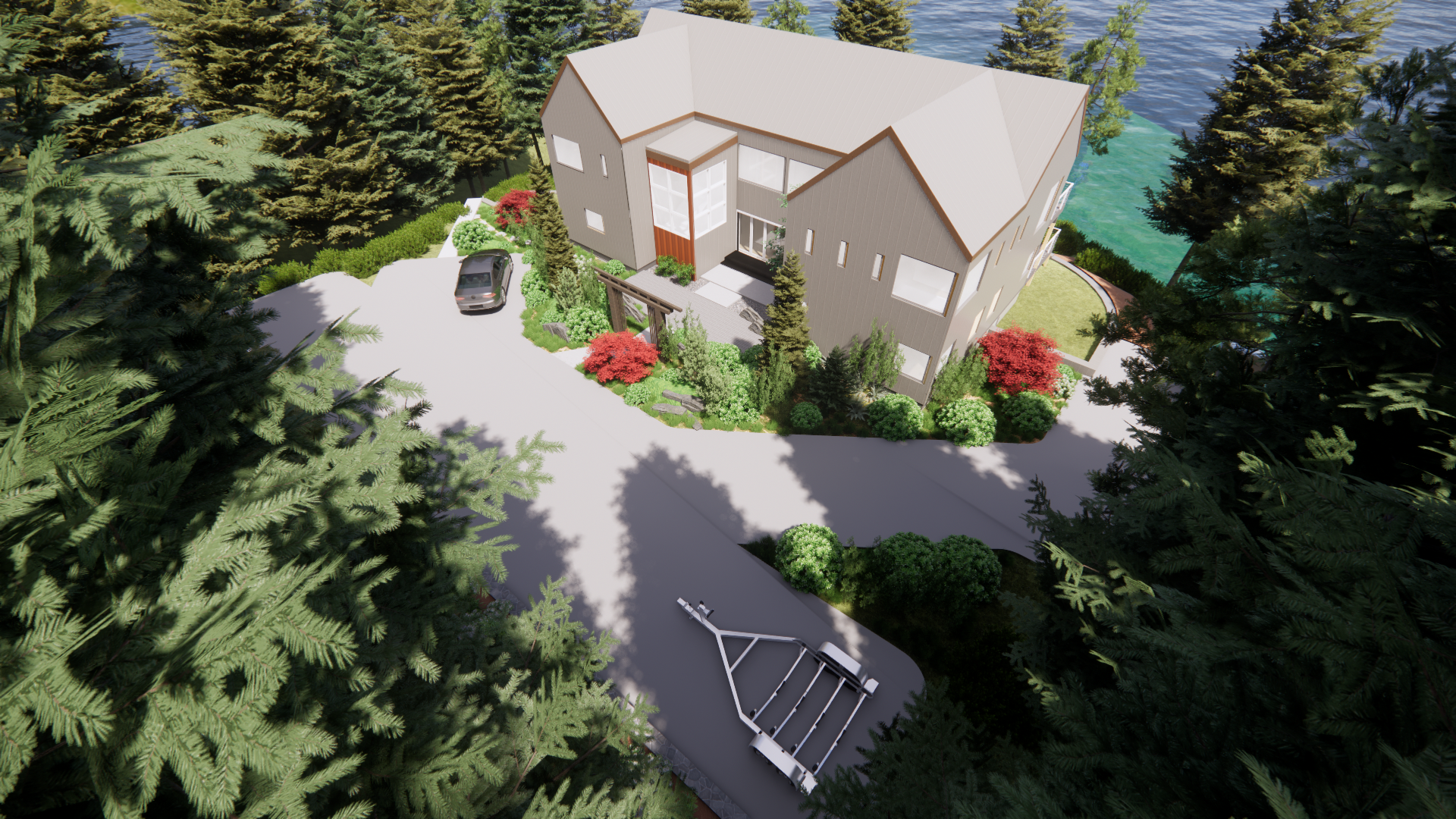 Additional parking is discreetly located along the side of the home, allowing the main entry space to remain open and functional while still accommodating larger family gatherings. Plantings are intentionally simple and restrained to support a low-maintenance landscape that will mature gracefully over time.