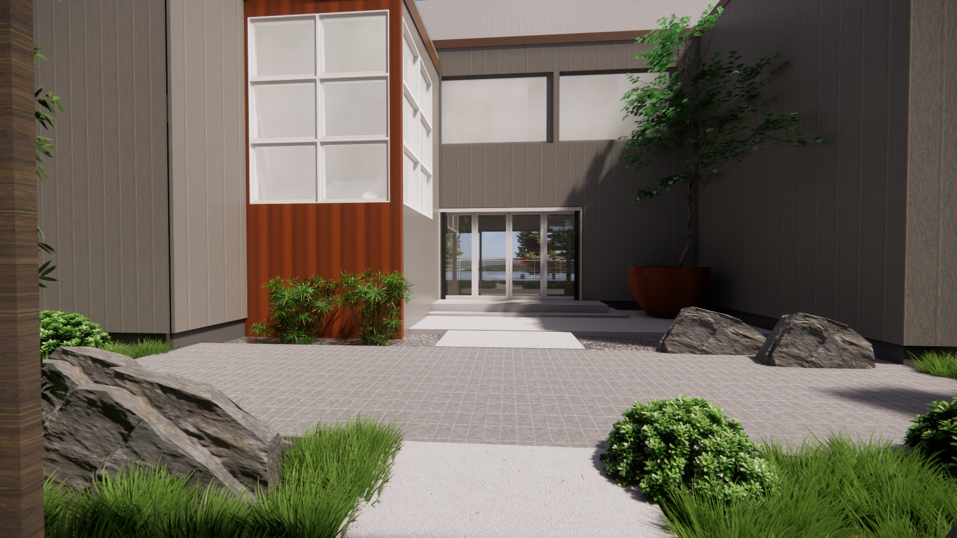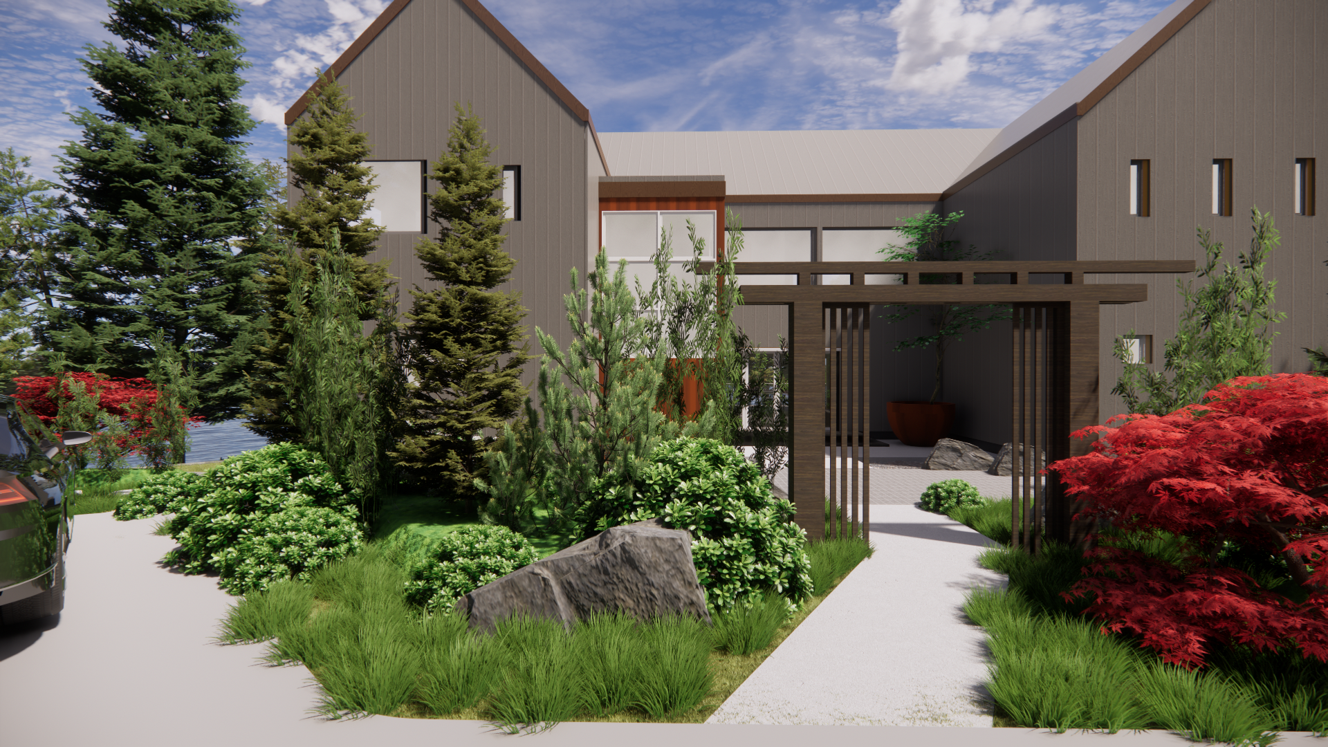 This Japanese-inspired courtyard and garden embraces a contemporary aesthetic that complements the renovated modern home. By thoughtfully utilizing water, stone, and native plantings, the design creates a calm and welcoming entrance while maintaining clear circulation for parking both vehicles and trailer attachments.