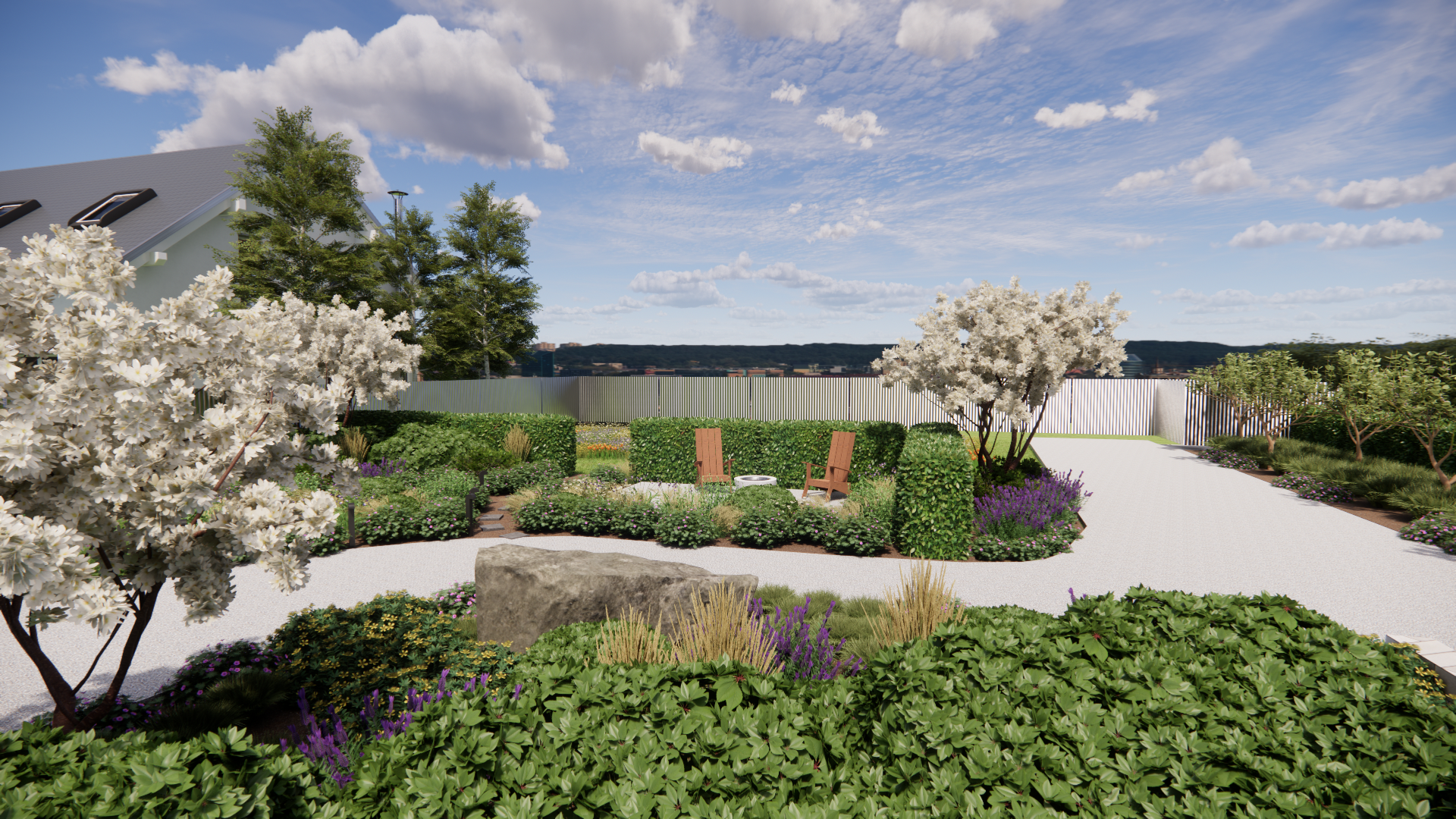 This master plan envisions a thoughtfully designed landscape that offers privacy, comfort, and tranquility. Carefully curated spaces invite relaxation, with designated zones that maximize stunning mountain views while providing the warmth and ambiance of a fire pit. A harmonious blend of shrubs and perennials is strategically arranged throughout the site, creating a lush, garden-like atmosphere while maintaining a low-maintenance design. Edible plants and vibrant cut flowers are seamlessly integrated into the landscape, adding both beauty and functionality. Ultimately, this plan fulfills all the client’s requested needs, bringing their vision to life with elegance and practicality