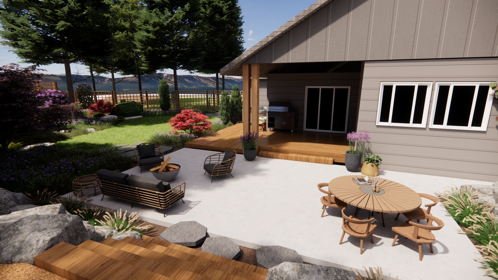 This masterplan envisions a vibrant, multi-layered backyard designed to balance social connection with everyday relaxation. The landscape is arranged across two elevations, creating distinct zones that serve a variety of purposes. Much of the work for this design will involve carefully regrading the backyard to optimize flow and function, as well as repurposing existing materials to enhance sustainability and character. A thoughtful blend of native and ornamental plantings will ensure a lush yet low-maintenance environment that supports a healthy, thriving garden. On the upper terrace, a dedicated production area will host higher-maintenance edible plants, maximizing sunlight exposure for robust harvests. Three primary social spaces, the patio, the platform garden, and the side yard, will offer flexible settings for gatherings both large and small. A practical utility zone near the garage will provide ample room for wood storage, splitting, and other outdoor chores, ensuring the backyard is as functional as it is beautiful.